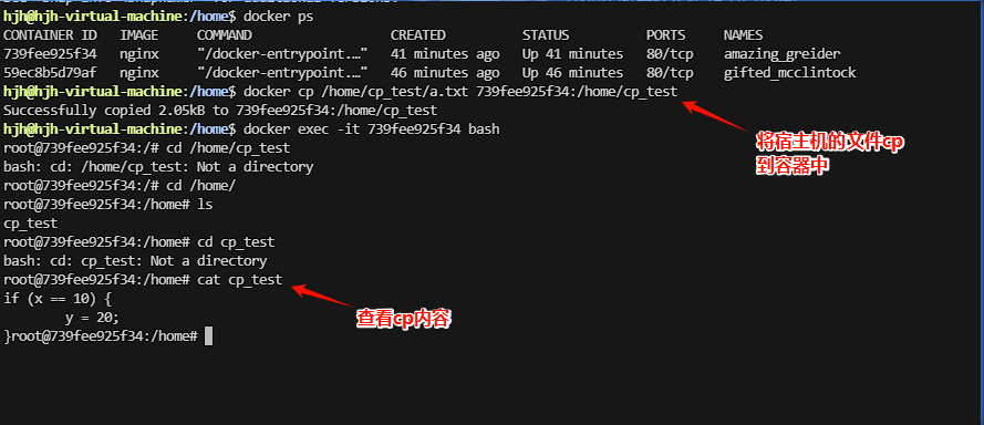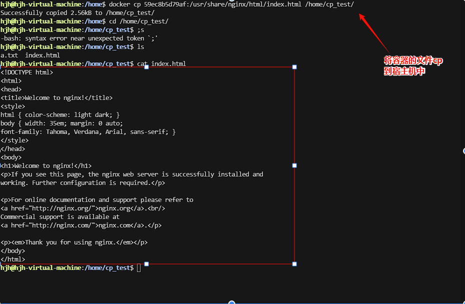 我们可以使用 docker cp 命令来实现容器和宿主机之间 文件和目录的相互拷贝