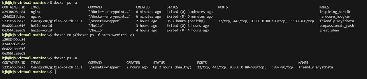 - 尝试删除所有非运行状态的容器 docker ps -f status=exited -q 或者 docker rm $(docker ps -f status=exited -q)
