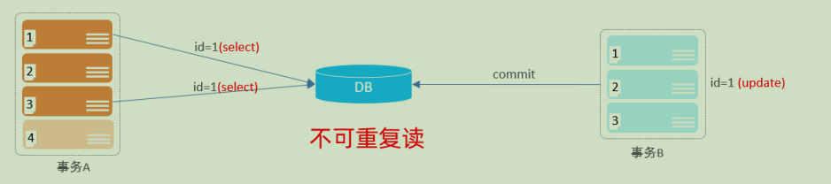 不可重复读是读取了其他事务更改的数据 ->update