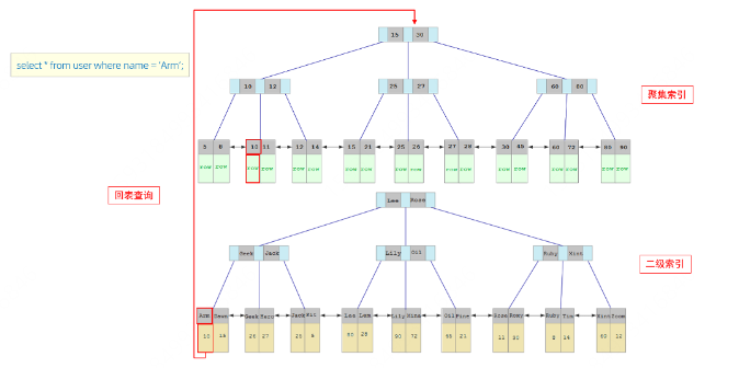 ①.由于是根据name字段进行查询,所以先根据name=‘Arm’到name字段的二级索引中进行匹配查找。但是在二级索引中只能查找到 Arm对应的主键值 10。