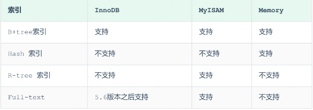 上述是MySQL中所支持的所有的索引结构,接下来,我们再来看看不同的存储引擎对于索引结构的支持情况。