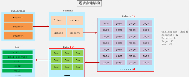 - 表空间: InnoDB存储引擎逻辑结构的最高层,ibd文件其实就是表空间文件,在表空间中可以包含多个Segment段。