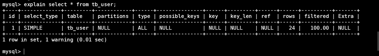 | Extra | Using where: Using Index 查找使用了索引,但是需要的数据都在索引列表中找到,所以不需要回表查询 。Using index condition:查找使用了索引,但是需要回表查询数据 |